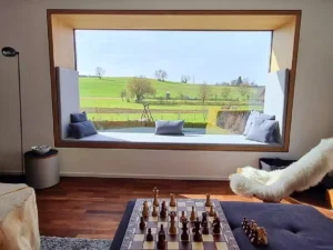 Der neue Lieblingsplatz der Familie: Windwoseat, oder besitzbares Fenster. Holzart Eiche (rahmenlos). Damit es auch an kühlen Tagen kuschelig warm ist am Fenster, ist die bequeme und abnehmbare Auflage in Lodenstoff mit Sitzheizung ausgeführt. Die schönen Kissen runden das ganze Bild ab und laden ab zum Entspannen.