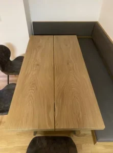 Als Holzart wurde Eiche gewählt, das meiner Meinung nach auch weiterhin das IN-Holz schlechthin bleibt. Der Massivholz-Tisch als Hingucker mit schönem „Schmetterlingsbrett“. So nennt man zwei aufeinanderfolgende Holzbretter von einem Stamm, die dann aufgeklappt oder gespiegelt verwendet werden. Dadurch erzielt man diesen „Schmetterlingseffekt“.
