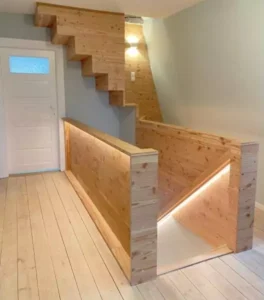 Das Werkstattbild zeigt die Treppe im Rohzustand. Zur Oberflächenbehandlung wurde die Treppe in ihre Einzelteile zerlegt. Unsere Schreiner haben die Treppe in Einzelteilen in den 4. Stock getragen, um sie dort vor Ort anzupassen, einzubauen und die Beleuchtung anzubringen.